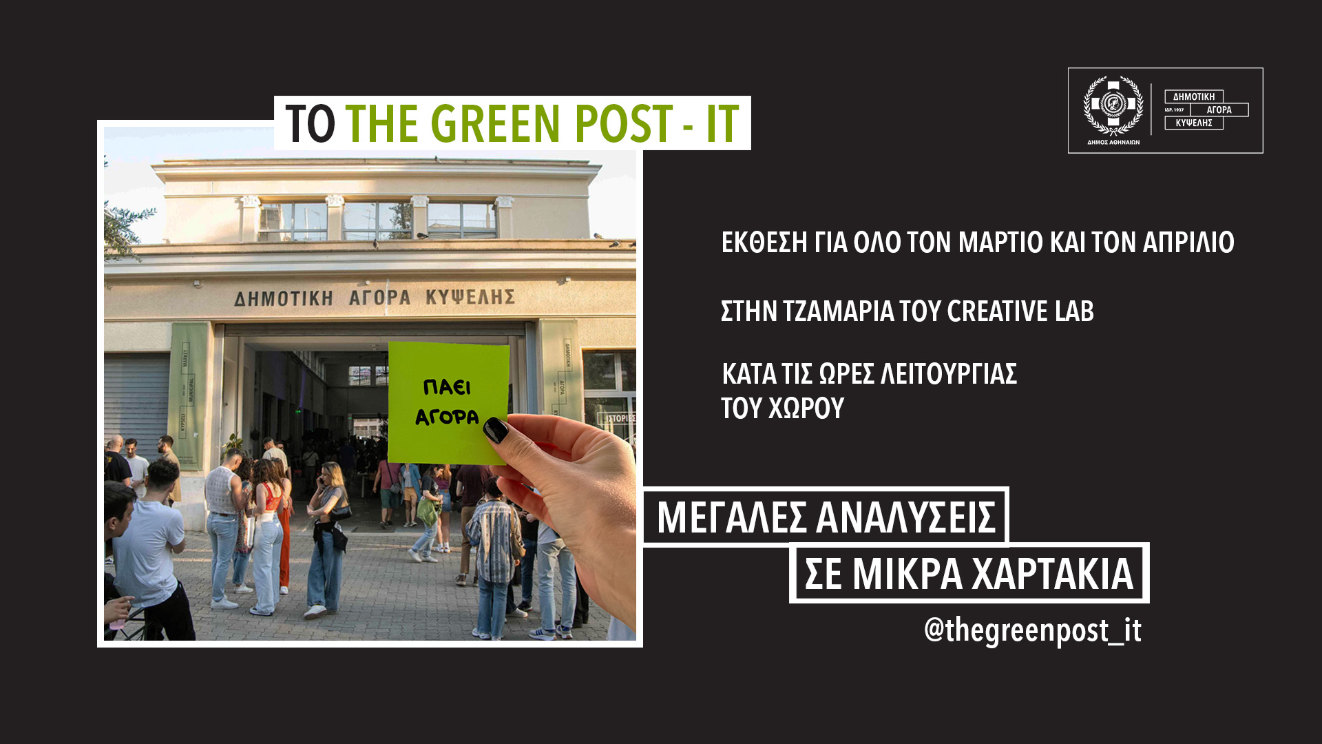 Οι απλές, σύνθετες, καθημερινές, αστείες, ντροπιαστικές, συνειδητές και ασυνείδητες σκέψεις που γράφτηκαν πάνω σε post it και απλώθηκαν στον digital κόσμο τα τελευταία 3 και κάτι χρόνια μέσα από το @thegreenpost_it, βγαίνουν στον πραγματικό κόσμο, σε αυτό που λέμε κανονική ζωή απ’ την οποία και εμπνέονται, και για όλο τον Μάρτιο θα βρίσκονται η μία δίπλα στην άλλη στο Αίθριο της Δημοτικής Αγοράς Κυψέλης.