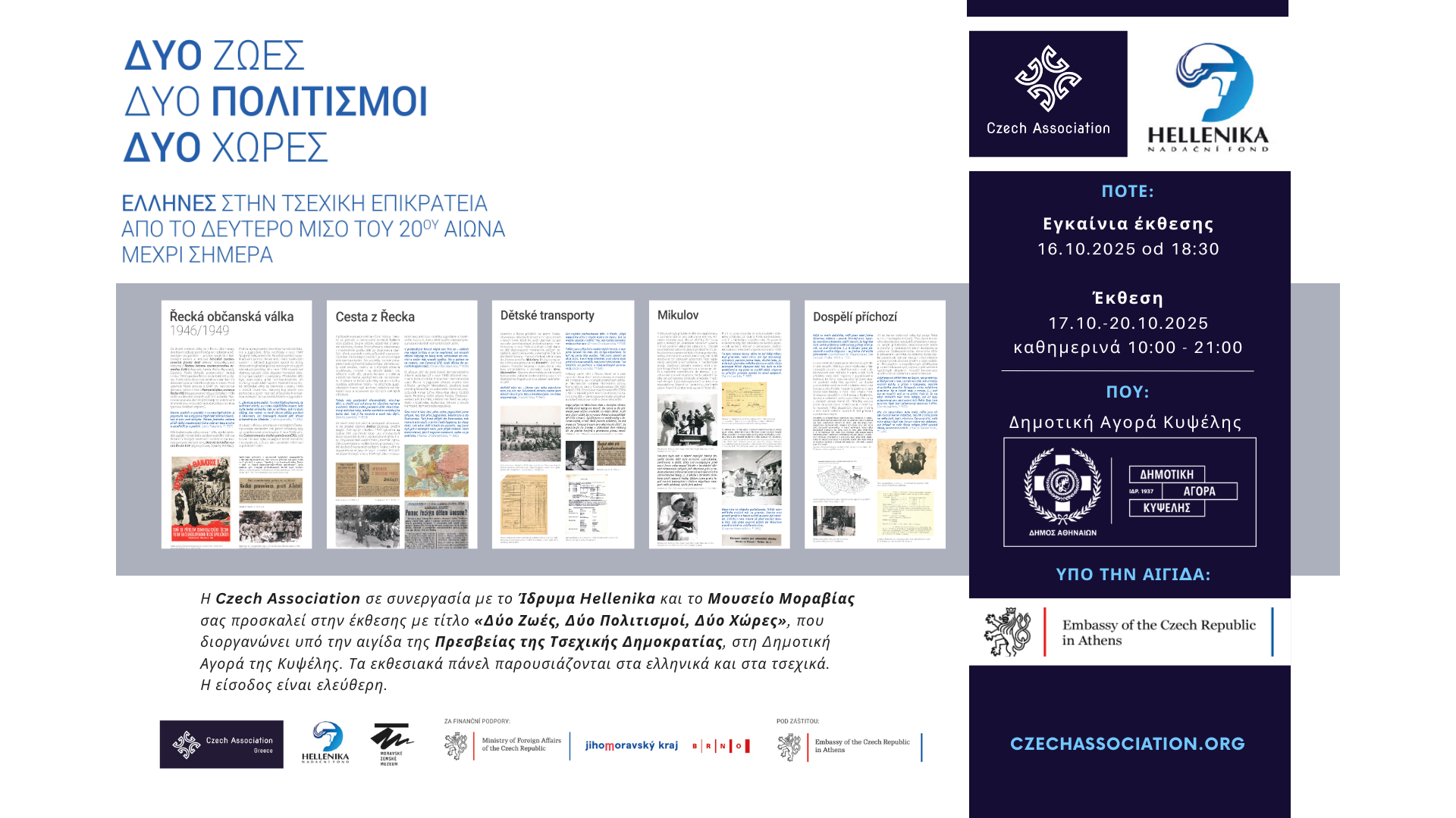 Με αφορμή την 75η επέτειο από το πρώτο μεγάλο μεταναστευτικό κύμα Ελλήνων προσφύγων στην επικράτεια της πρώην Τσεχοσλοβακίας, ο Τσέχικος Σύνδεσμος Ελλάδος «Czech Association in Greece» παρουσιάζει την έκθεση με τίτλο «Δύο ζωές, δύο πολιτισμοί, δύο χώρες. Οι Έλληνες στην τσεχική επικράτεια από το δεύτερο μισό του 20ού αιώνα μέχρι σήμερα». Η έκθεση εξοικειώνει το ευρύ κοινό με την άφιξη των Ελλήνων στην Τσεχοσλοβακία, τη σταδιακή ένταξή τους αλλά και τη διατήρηση ενός συγκεκριμένου πολιτισμού.