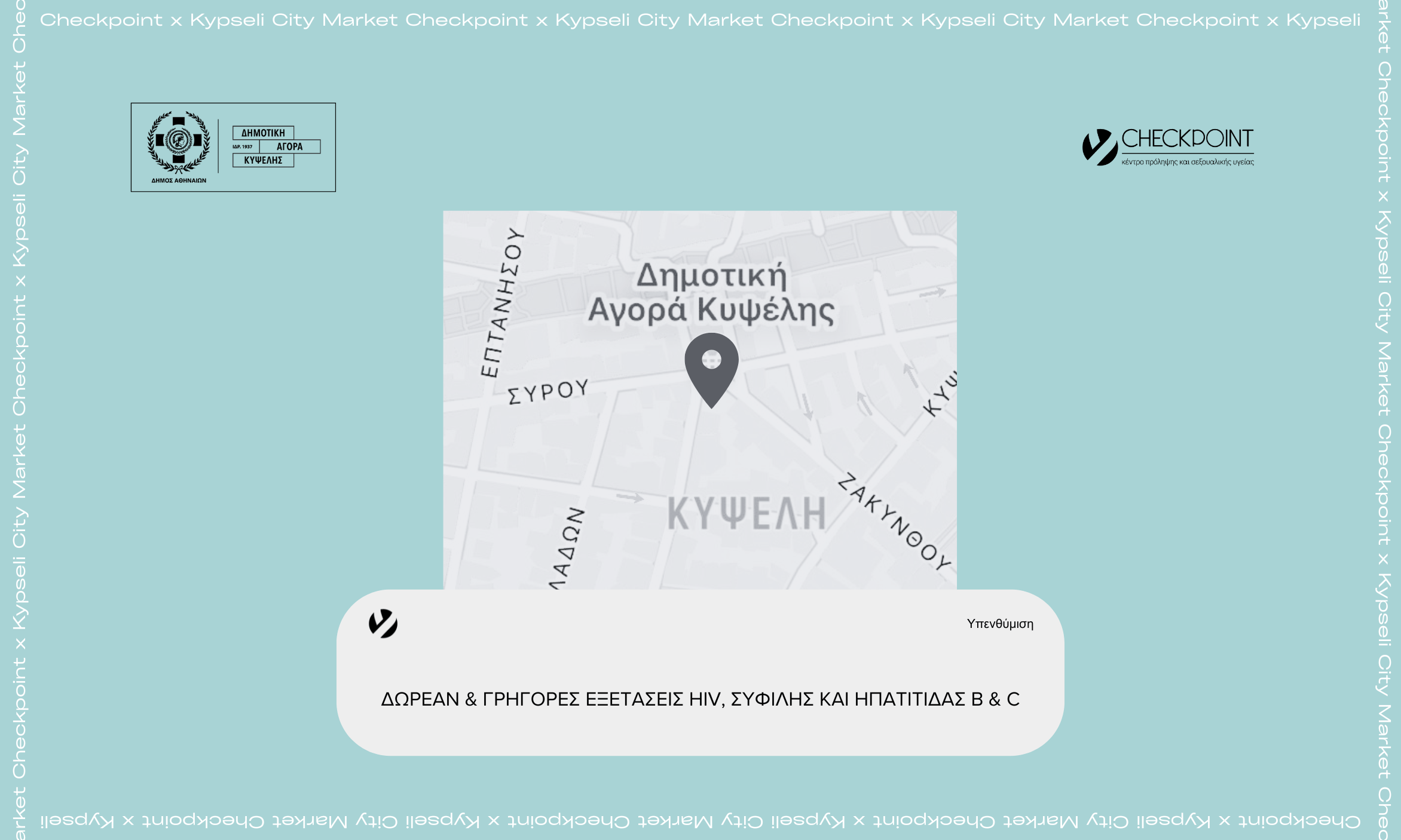Βάλτε την τακτική εξέταση για HIV και την ενημέρωση για θέματα σεξουαλικής υγείας στο πρόγραμμά σας! Το προσωπικό του Athens Checkpoint θα βρίσκεται στη Δημοτική Αγορά Κυψέλης κάποιες Δευτέρες κάθε μήνα, από τις 11:00 ως τις 15:00, προσφέροντας δωρεάν, γρήγορες εξετάσεις HIV/ ηπατίτιδας B & C/ σύφιλης και ενημερώνοντας το κοινό σχετικά με θέματα σεξουαλικής υγείας.