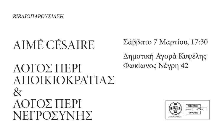 Οι Εκδόσεις San Casciano σας προσκαλούν στην παρουσίαση του βιβλίου του Aimé Césaire «Λόγος περί αποικιοκρατίας» και «Λόγος περί νεγροσύνης», δύο κείμενα-αναφοράς της αντι-αποικιακής σκέψης που παραμένουν εξαιρετικά επίκαιρα.
