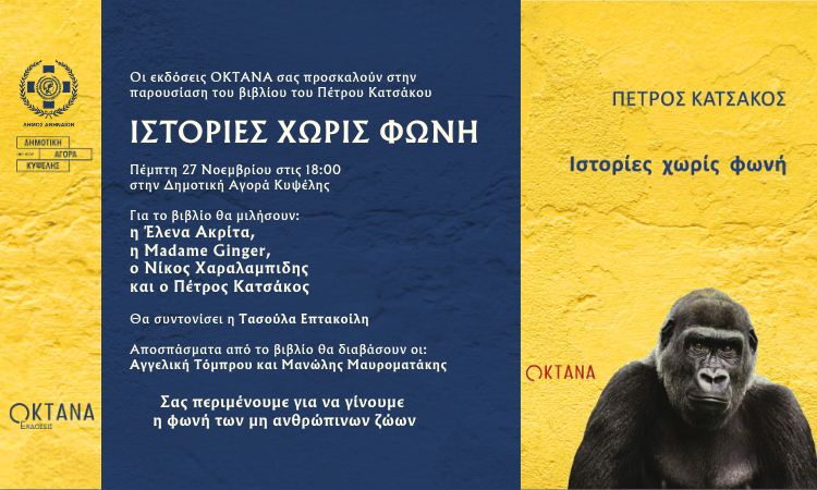 Οι εκδόσεις ΟΚΤΑΝΑ σας προσκαλούν στην παρουσίαση του βιβλίου του Πέτρου Κατσάκου “Ιστορίες χωρίς φωνή” Την Πέμπτη 27 Νοεμβρίου.