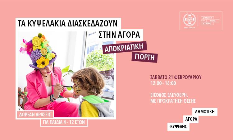 Σε αποκριάτικο κλίμα, η Δημοτική Αγορά Κυψέλης προσκαλεί τους μικρούς μας φίλους, τα αγαπημένα μας Κυψελάκια, σε μία ημέρα γεμάτη χαρά και παιχνίδι! Ετοιμαστείτε για γέλια, εκπλήξεις και πολλές αποκριάτικες δραστηριότητες.